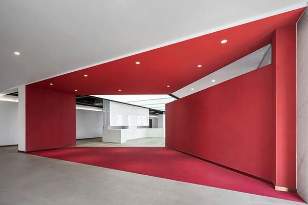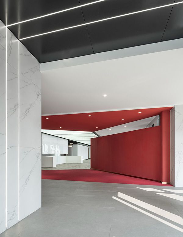 展厅以红色开放性造型为入口,通过大面积的几何色块将空间支解,由开阔转为深刻。在与一楼区分内容展示的同时强调“中国心、中国造”,对内兼容、对外开放的红色文化。